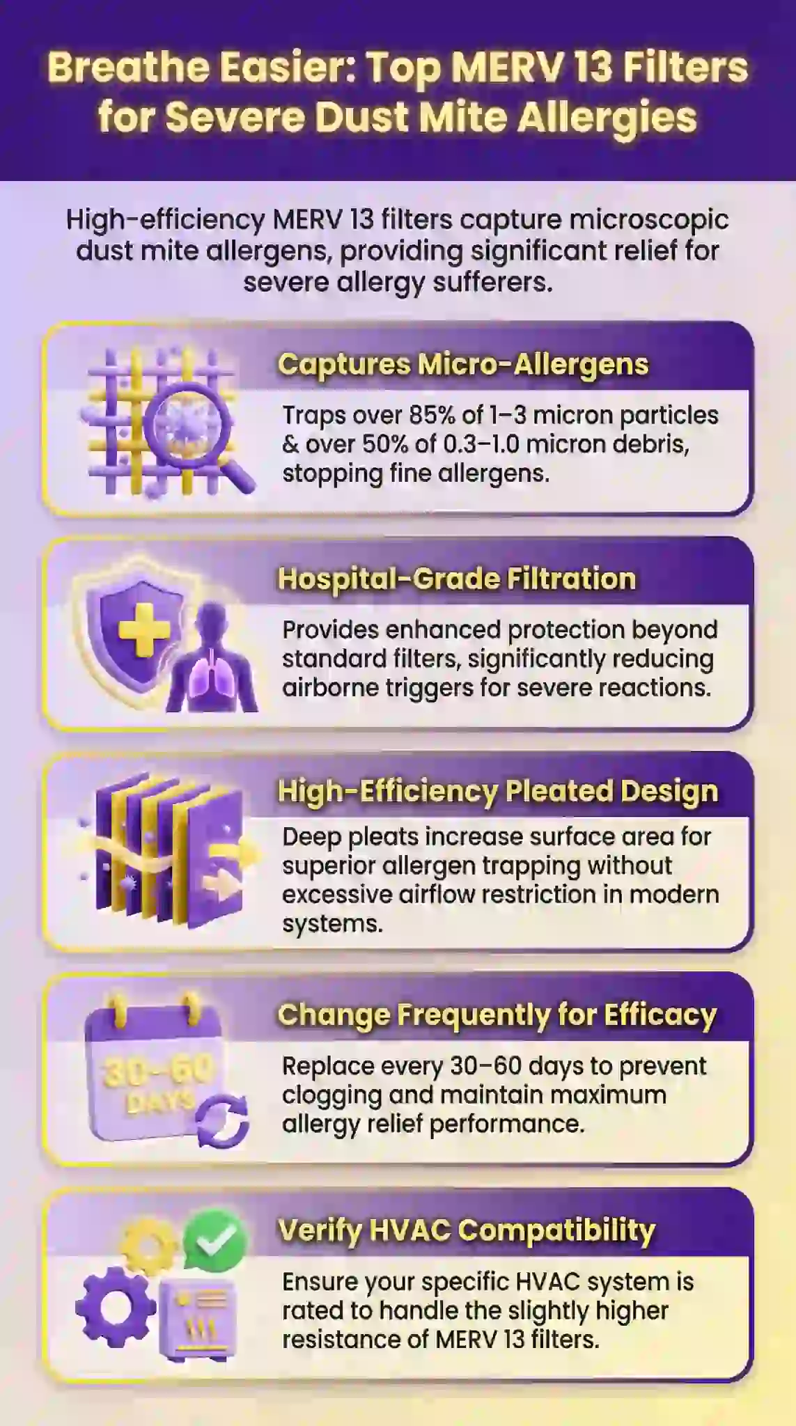 MERV 13 captures 85-90% of airborne dust mite particles effectively