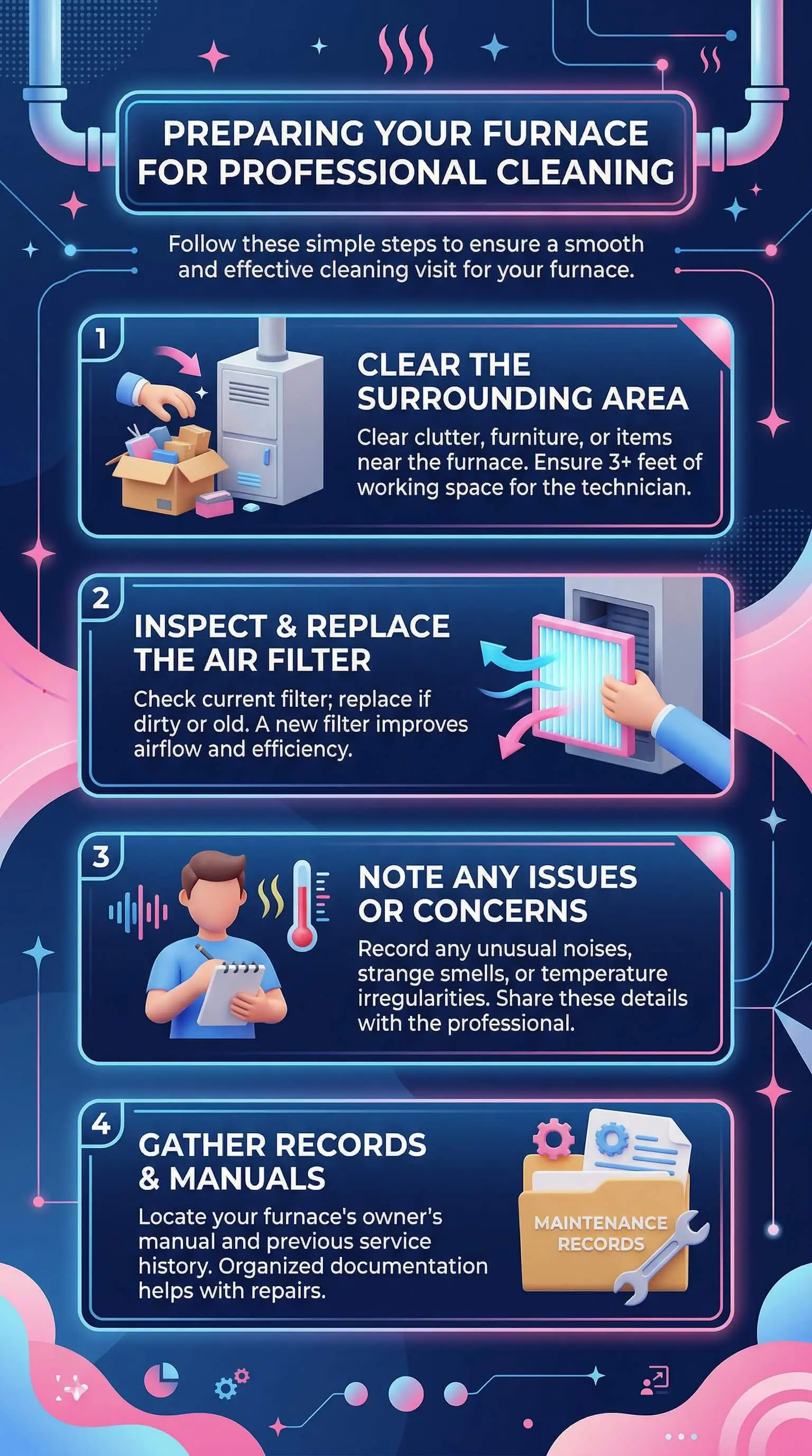 Cleaning a furnace involves both what you do before a professional arrives and what a trained technician handles during the visit itself. Here is the complete picture: